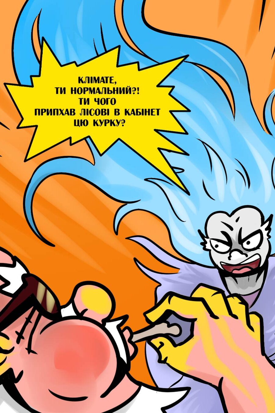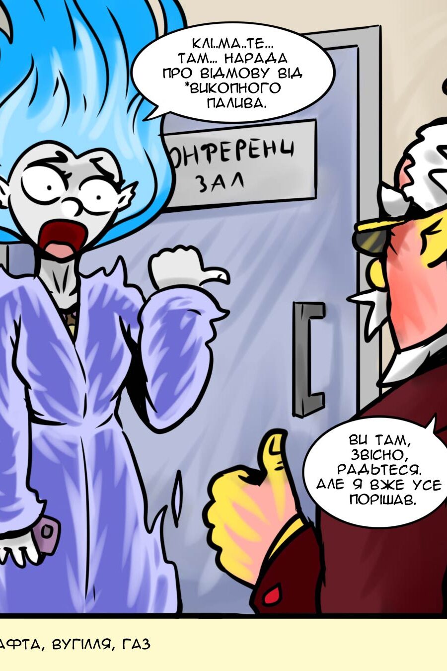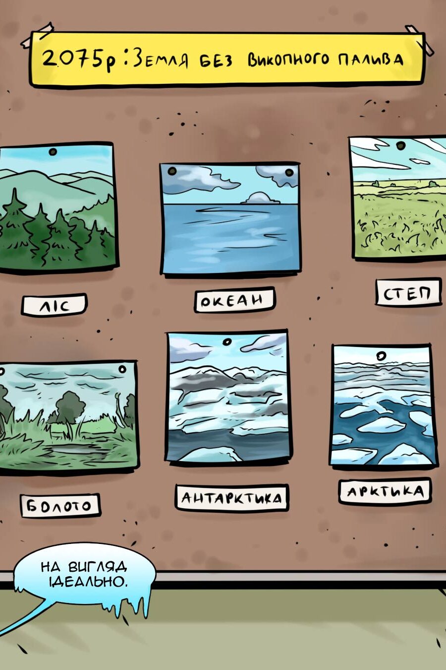 Також у мальописі наголошено, що спалювання викопного палива — вугілля, нафти та природного газу — є головним джерелом парникових газів. Під час горіння в атмосферу потрапляє передусім вуглекислий газ (CO₂), а також метан і закис азоту. Через зростання концентрації парникових газів підсилюється природний парниковий ефект, і середня температура на планеті підвищується.