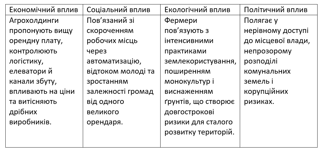 Фермери також відзначають, що вплив агрохолдингів виходить далеко за межі земельного ринку — він торкається соціального життя громад, місцевої політики та стану довкілля: