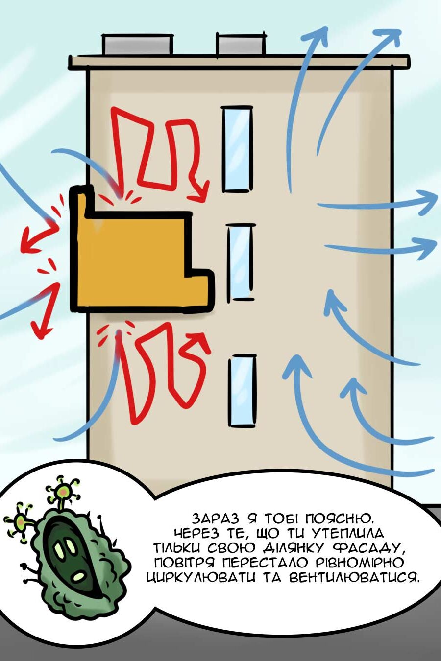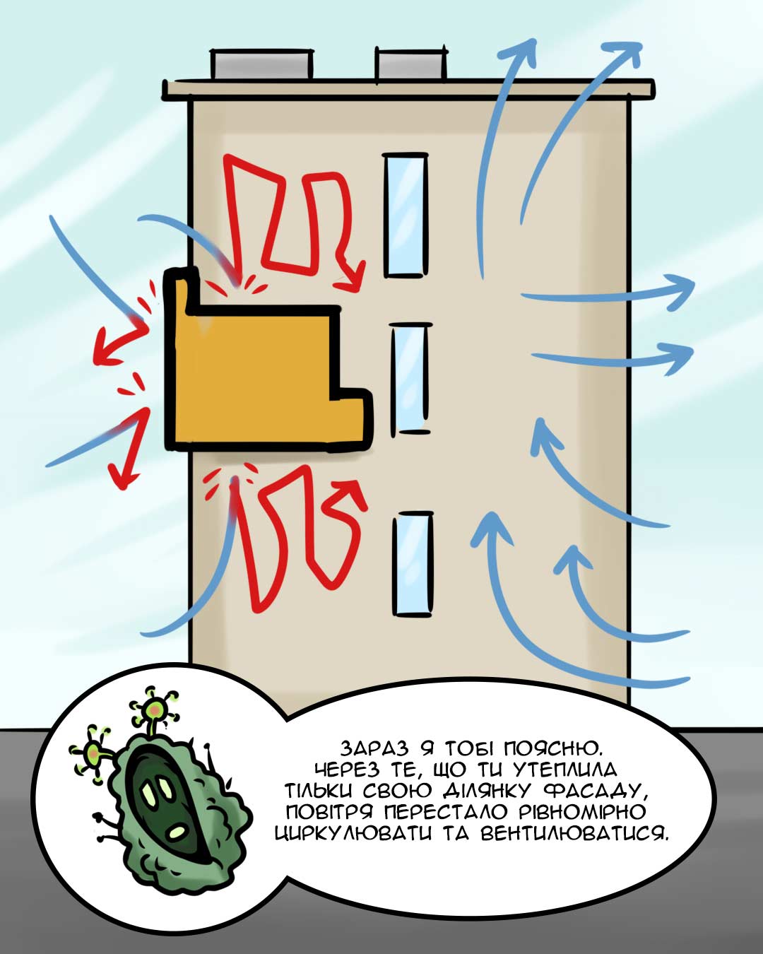 Через зовнішні огороджувальні конструкції (стіни, перекриття, дахи) будинки втрачають 30–45% тепла. Позбутися втрат допомагає комплексне утеплення. У приватних будинках варто утеплювати стіни, дах, підвал, а за необхідності і фундамент на глибину промерзання ґрунту. А у багатоквартирних будинках це потрібно робити у співпраці з сусідами і одразу для всього фасаду. Адже клаптикове утеплення, про яке розказано у мальописі, не лише незаконне, а й може призвести до появи грибка, плісняви та тріщин у будинку, що призведе до його руйнування згодом.