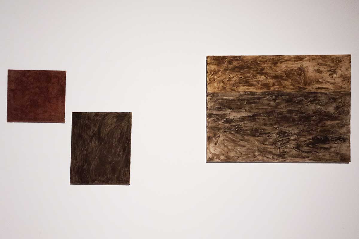 Основне фото – фрагмент виставки «Серце землі», в рамках якої відбувалася дискусія. Картини Каті Бучацької «Гостомельська червона», «Умбра мощунська», «Пейзаж» написані саморобними олійними фарбами, виготовленими із землі територій, які пережили обстріли чи окупацію.